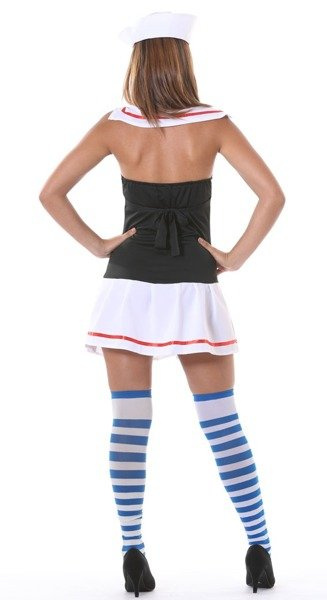 Sukienka krótka w granatowe paski z czerwonymi kokardkami.