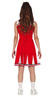 Sukienka bez rękawów w kolorze czerwonym, z białymi i czarnymi wstawkami oraz napisem.