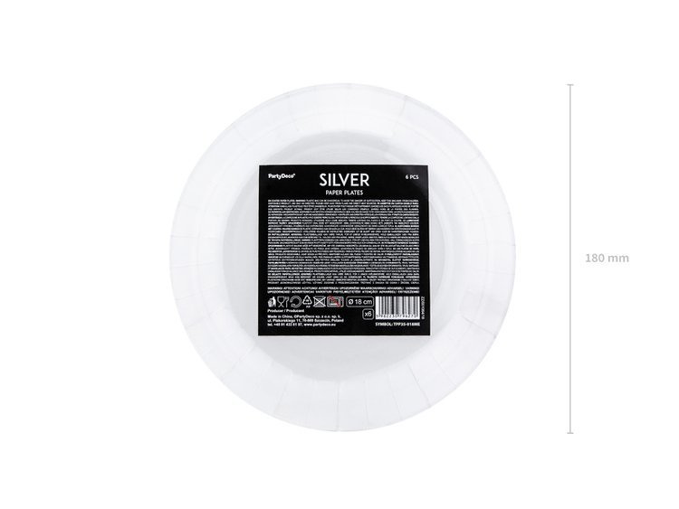 Talerzyki papierowe okrągłe w kolorze srebrnym.