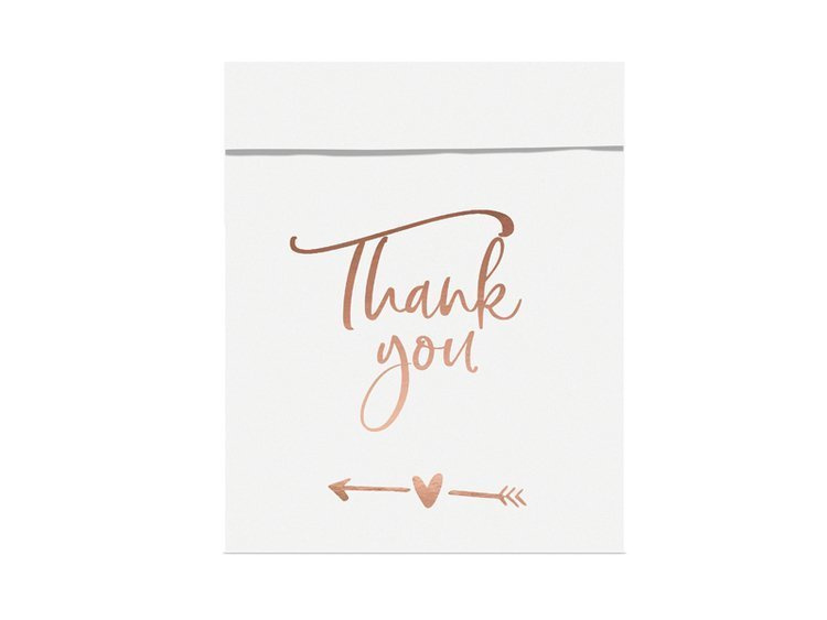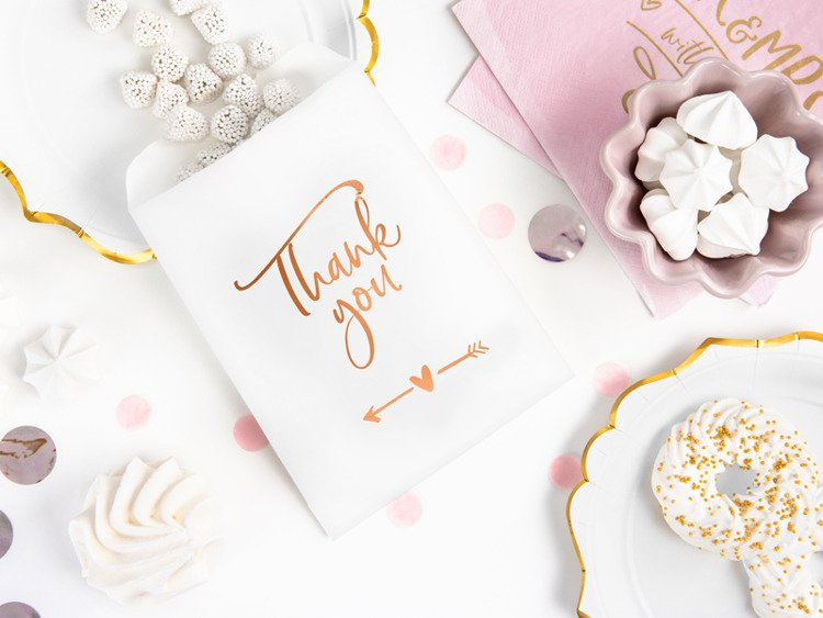 Zestaw papierowych torebek w kolorze białym z różowym metalizowanym napisem Thank You.