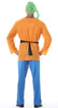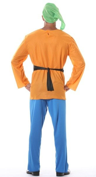 Strój krasnala w kolorze pomarańczowo-niebieskim z brązowym paskiem.