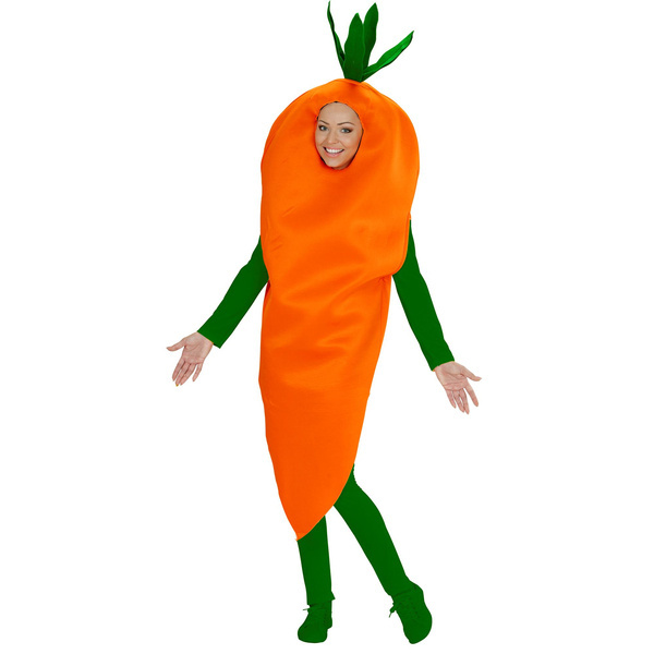 Strój marchewki wykonany z miękkiego materiału w kolorze pomarańczowym.