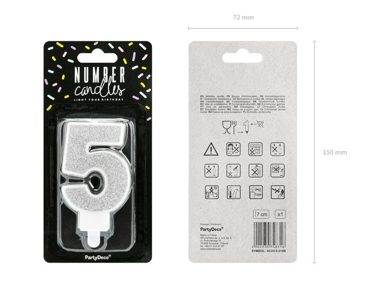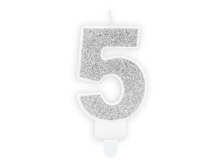 Świeczka w kolorze srebrnym, w kształcie cyfry 5.