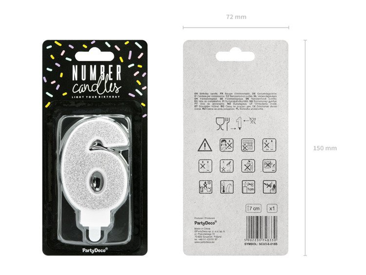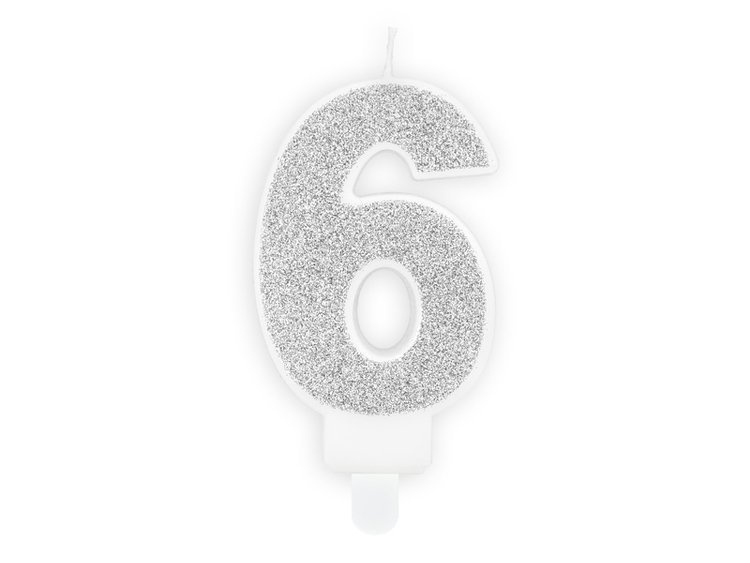 Świeczka urodzinowa Cyferka 6 w kolorze srebrnym brokatowym, rozmiar ok. 7 cm.