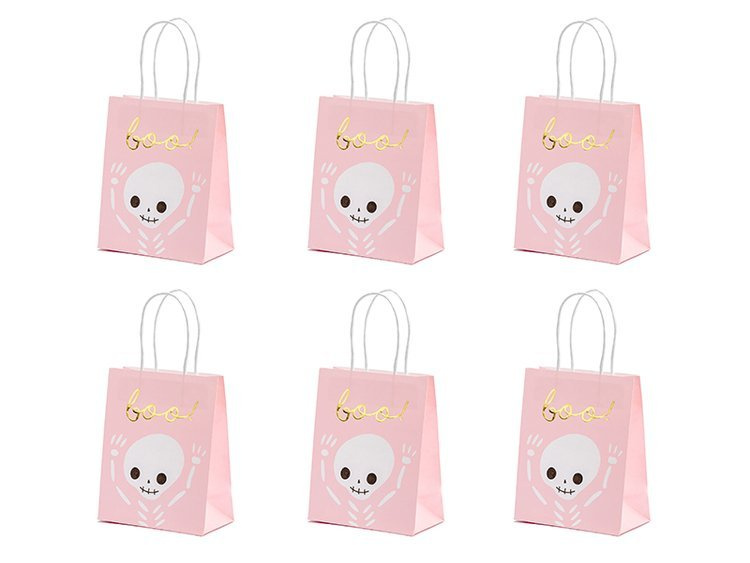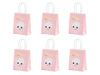 Torebka na prezent w kolorze różowym z biało-czarno-złotym nadrukiem.