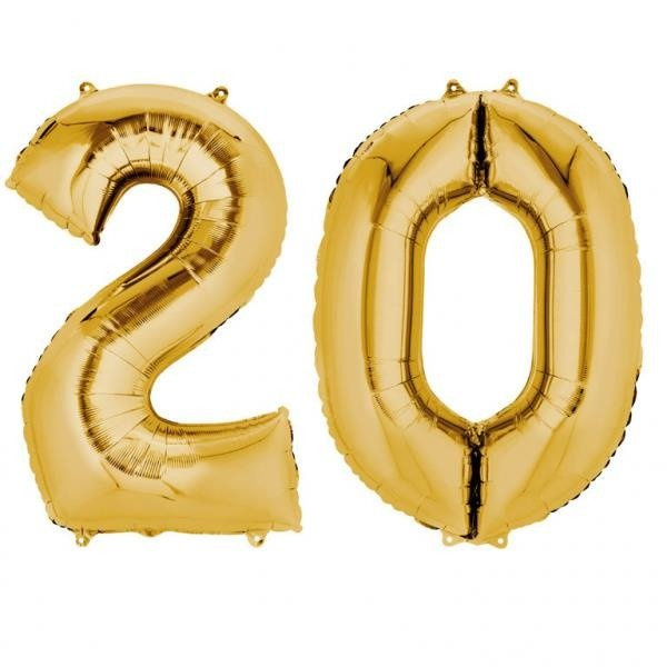 Balony foliowe, złote metaliczne w kształcie cyfry 20.
