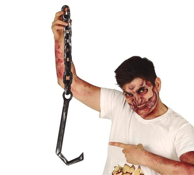 Hak zawieszony na łańcuchu w kolorze czarno-srebrnym.