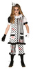 Sukienka czarno-białym, wykonana z materiału. Ozdobiona czarnymi falbankami.