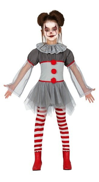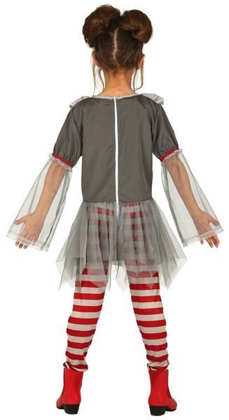 Sukienka szara, ozdobiona tiulem i kołnierzem z falbanek.