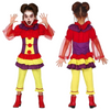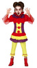 Sukienka fioletowo-żółto-czerwona z tiulem i pomponami.