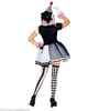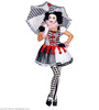 Sukienka czarno-biała z czerwonymi kokardkami i pomponami. Posiada gumkę w pasie.