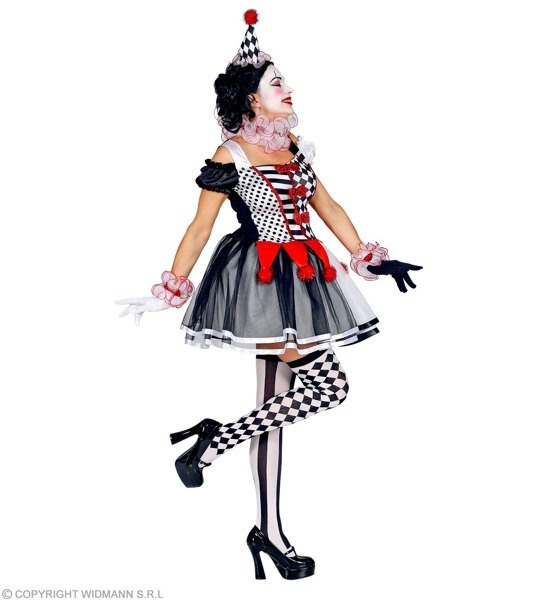 Kołnierz i mankiety falbaniaste biały z czerwonym wykończeniem.
