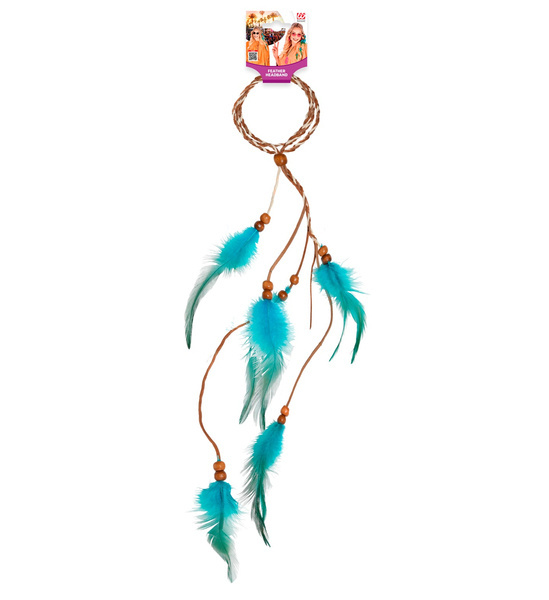 Zakończona pojedynczymi rzemykami z koralikami i piórkami.