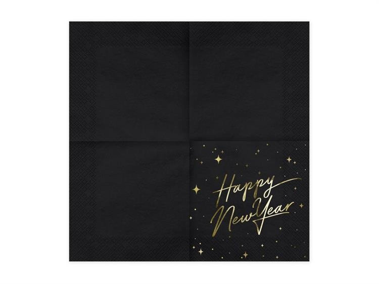 Serwetki papierowe w kolorze czarnym ze złotym metalizowanym nadrukiem i napisem Happy New Year.