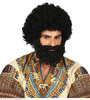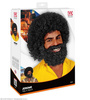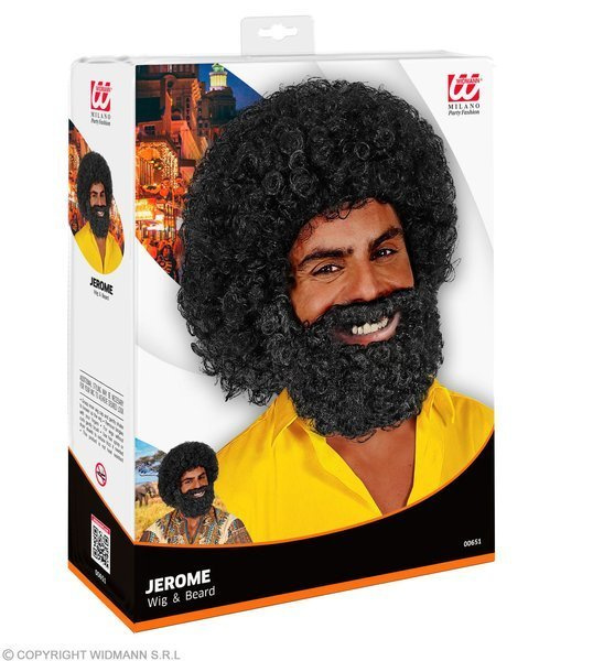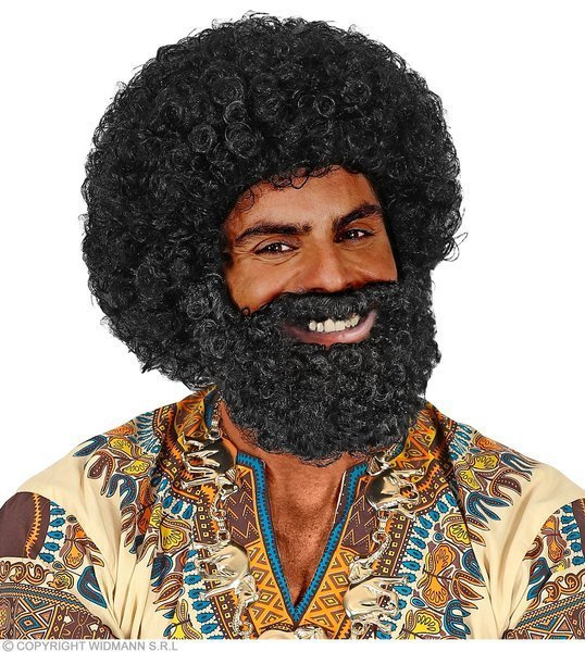 Włosy w kolorze czarnym, afro. Broda kręcona, czarna, z