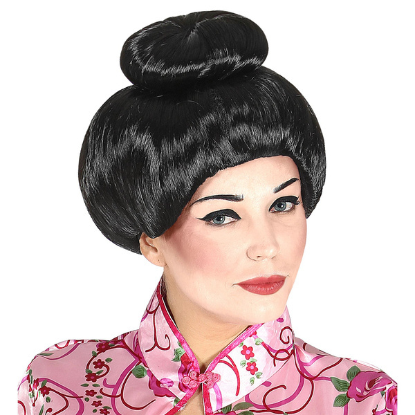 Włosy proste, z kokiem na czubku.