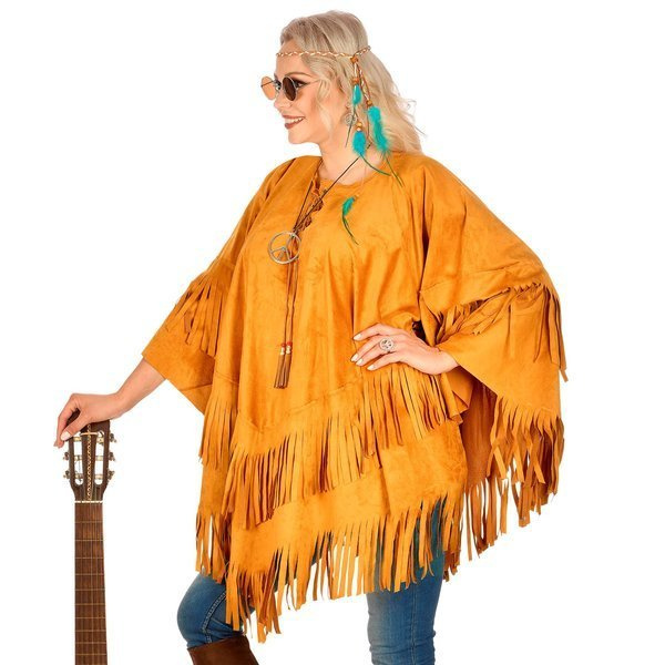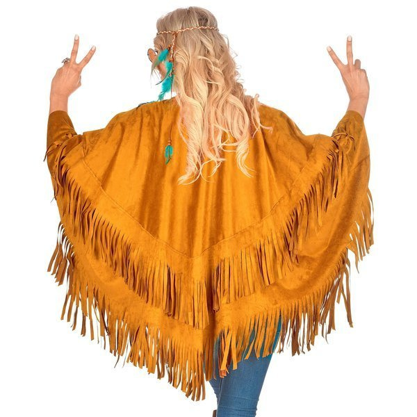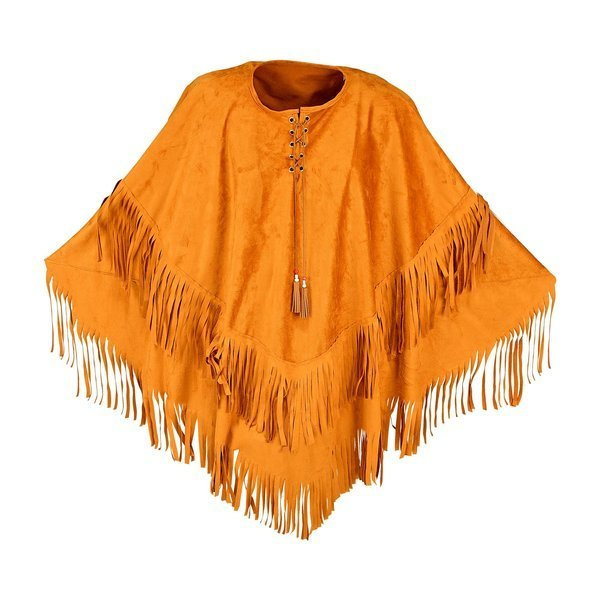 Ponczo w kolorze brązowym, wykończone frędzlami.