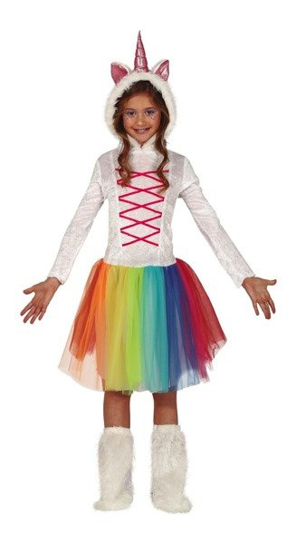 Sukienka z długim rękawem z kolorowym dołem oraz uszami i rogiem jednorożca na kaptirze.