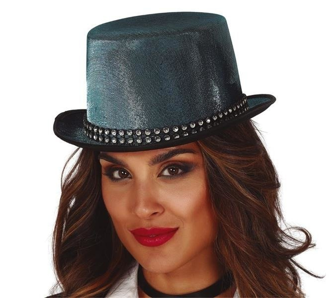 Cylinder błyszczący w kolorze turkusowym z doczepionymi cekinami.