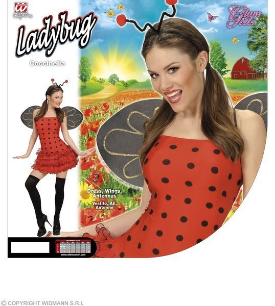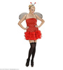 Sukienka w kolorze czerwonym, zakończona falbankami. Skrzydełka czarne. Opaska z czułkami.