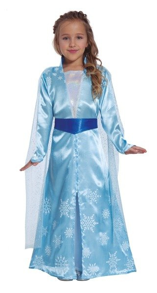 Błękitna sukienka zdobiona śnieżynkami i tiulowym materiałem z brokatem.