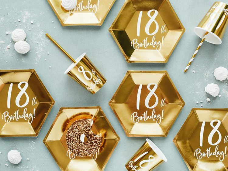 Talerzyki papierowe w kolorze złotym metalizowanym z białym napisem 18th Birthday!.