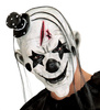 Maska lateksowa straszny klaun w kolorze: czarno-białym.Upiorny makijaż dodaje masce czarnego charakteru. Z maski wystają szare pasma włosów.