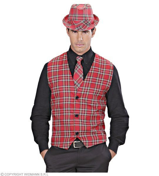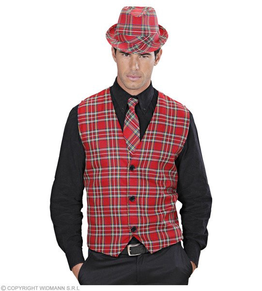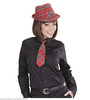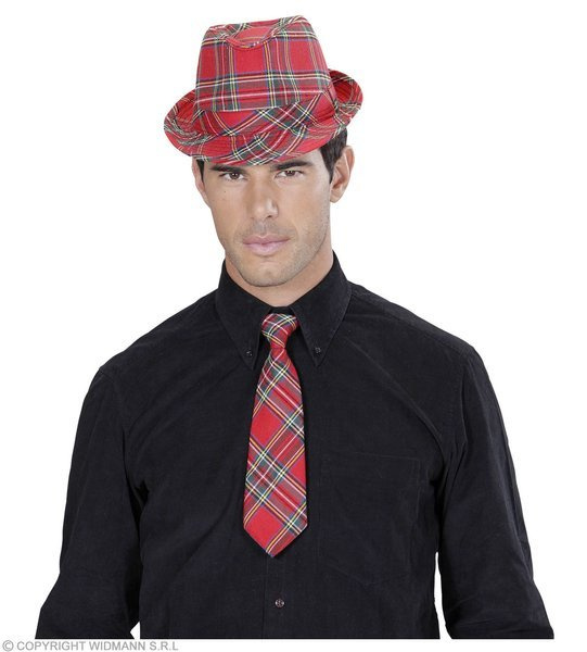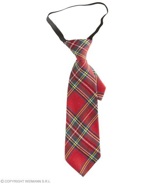Krawat w kolorze czerwonym w szkocką kratkę. Gotowy do założenia, bez konieczności wiązania (pod kołnierzyk chowa się czarną gumkę).