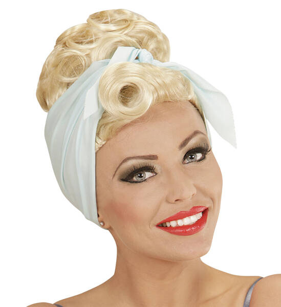 Peruka w kolorze: blond. Włosy spięte w kok, z grzywką/ loczkiem. Całość przewiązana błękitną chustką.