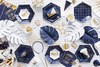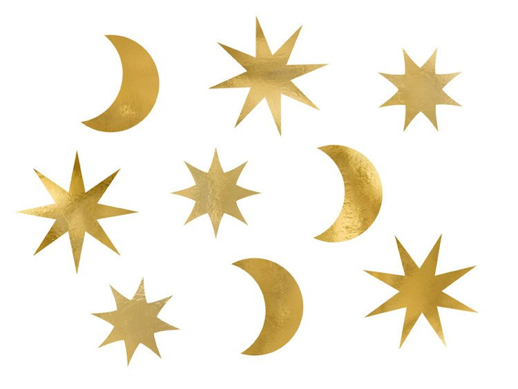 Dekoracje papierowe Let's Celebrate w kolorze złotym lustrzanym, mix wzorów (gwiazdki i księżyce), wymiary ok. od 5 x 5 cm do 8 x 8 cm.(1 karton / 50 op.)(1 op. / 9 szt.)
