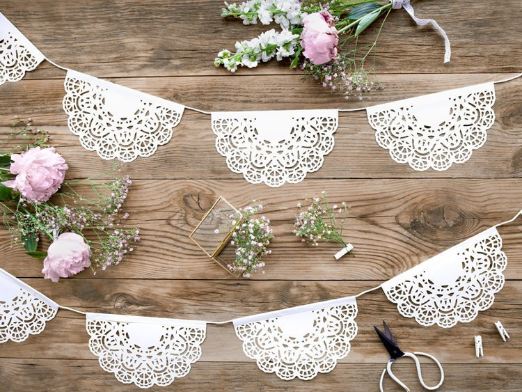 Koronkowa girlanda wykonana z papieru w kolorze białym, długość ok. 1,83 m, wysokość ok. 13 cm. (1 karton / 50 szt.)