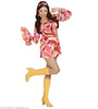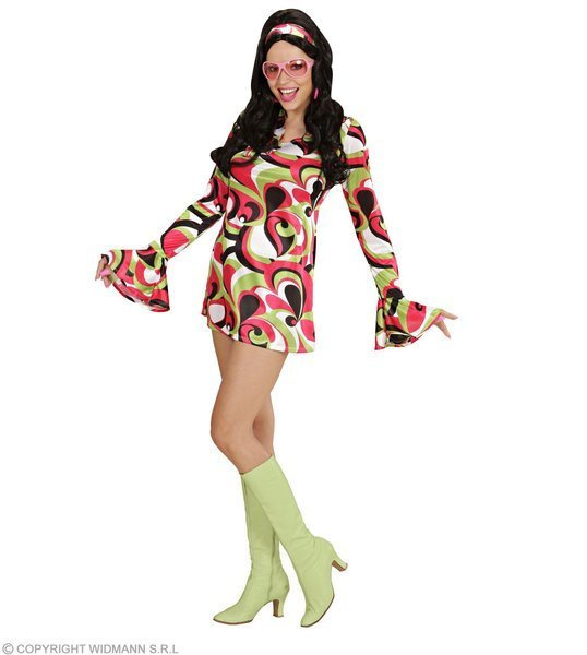- krótka sukienka z długimi rękawami, rozszerzanymi w stylu lat 70,