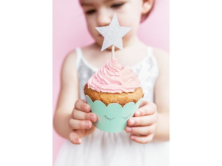 Dekoracje do muffinek Gwiazdki w kolorze srebrnym brokatowym.