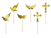 Dekoracje do muffinek I Komunia Świeta, wykonane z papieru w kolorze złotym lustrzanym, mix kolorów i wzorów do samodzielnego złożenia. Zestaw zawiera 6 karteczek, 6 naklejek i 6 patyczków. Wymiary po złożeniu ok. 8,5 cm - 11 cm.(1 karton / 50 op.)(1 op. / 6 szt.)