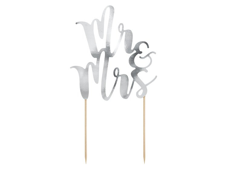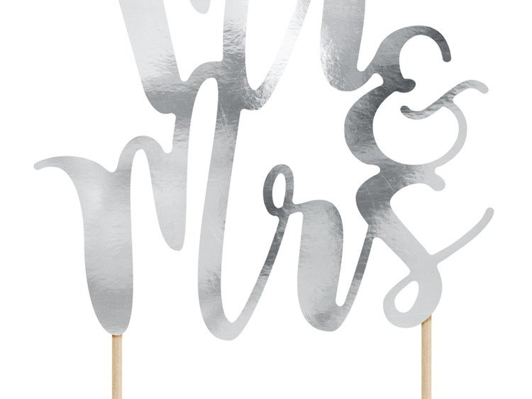 • Topper na tort Mr&Mrs, wykonany z papieru lustrzanego w kolorze srebrnym.