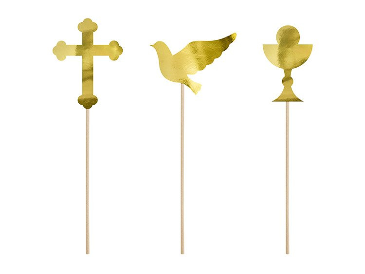 Toppery na tort I Komunia Święta, złoty, 31,5cm (1 karton / 50 op.) (1 op. / 6 szt.)
