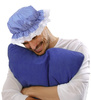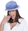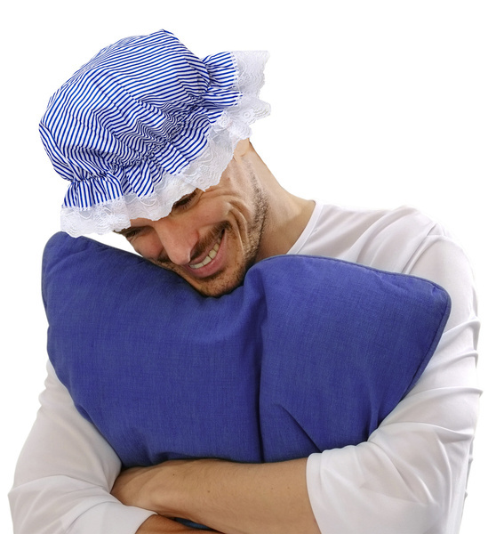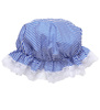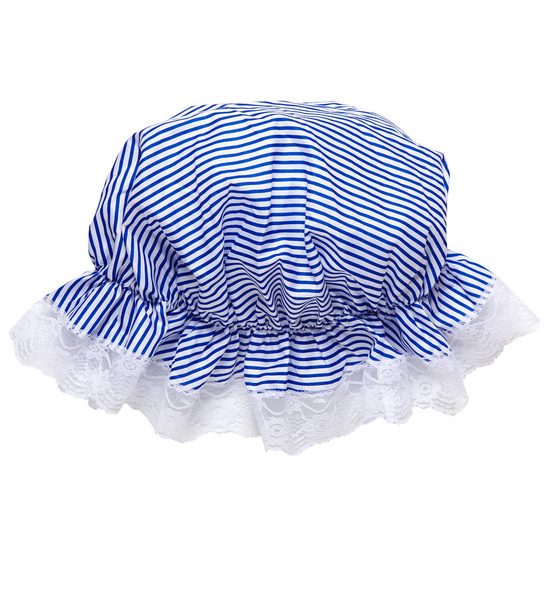Czepek śpiocha na gumce. Wykończony subtelną białą falbanką. Kolor: niebiesko-biały. Wzór: delikatne paseczki. Wykonany z polyestru.