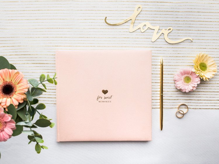 Księga Gości oprawiona papierem w kolorze pudrowego różu z napisem For sweet memories w kolorze różowego złota.