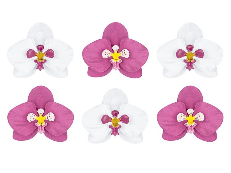 Dekoracje papierowe Aloha - Orchidee w kolorze białym i fuksji, do samodzielnego złożenia, w zestawie: 18 elementów do sklejenia (śr. kwiatów ok. 8,5 cm - 3 szt. w kolorze białym i 3 szt. w kolorze fuksji) i 12 kawałków taśmy.