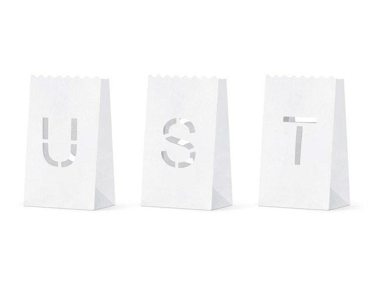 Lampiony na świecę w kształcie torebek, zestaw zawiera 11 lampionów z wyciętymi literami, tworzącymi napis Just Married. Wymiary po rozłożeniu ok. 11.5 x 19 x 7 cm. Produkt wykonany z niepalnego papieru.(1 karton / 50 op.)(1 op. / 11 szt.)