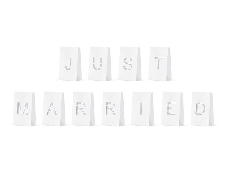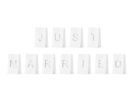Lampiony na świecę w kształcie torebek, zestaw zawiera 11 lampionów z wyciętymi literami, tworzącymi napis Just Married. Wymiary po rozłożeniu ok. 11.5 x 19 x 7 cm. Produkt wykonany z niepalnego papieru.(1 karton / 50 op.)(1 op. / 11 szt.)