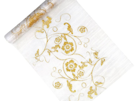 Organza w kolorze białym ze złotym, jednostronnym, brokatowym nadrukiem, wymiary 0,36x9 metrów.(1 karton / 24 szt.)