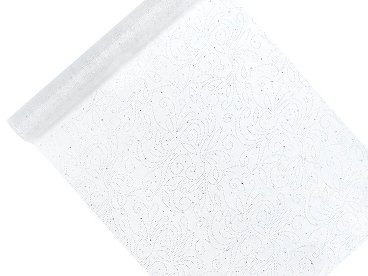 Organza w kolorze białym z perłowym, jednostronnym nadrukiem, wymiary 0,48x9 metrów.(1 karton / 24 szt.)