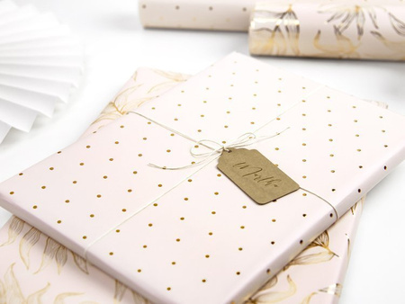 Papier do pakowania w kolorze różowym ze złotymi metalizowanymi wzorami liści oraz kropek.