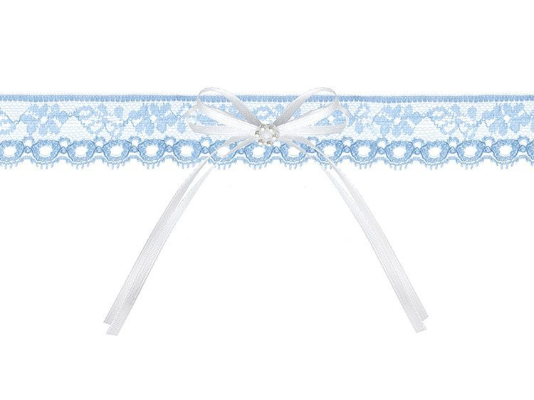 Podwiązka koronkowa w kolorze błękitnym z satynową tasiemką i perłowym kwiatkiem.