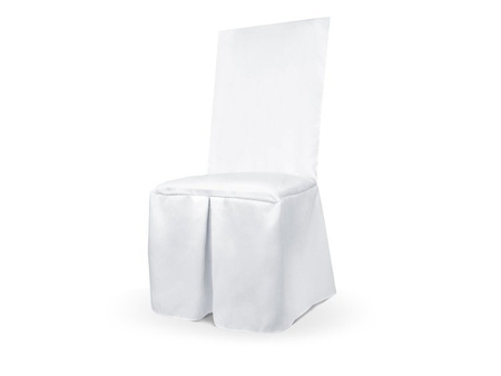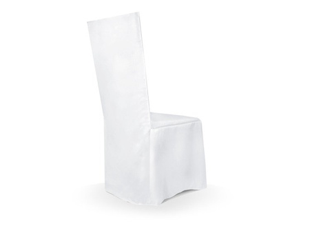 Pokrowiec z matowej tkaniny w kolorze białym z jedną zakładką. Podane na rysunku wymiary to długości maksymalne, pokrowce ładnie układają się również na krzesłach mniejszych.(1 karton / 50 szt.)