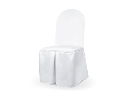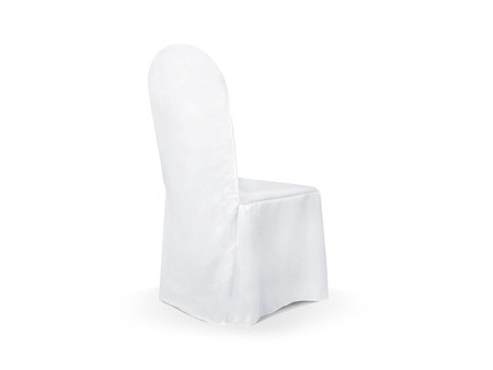 Pokrowiec z matowej tkaniny w kolorze białym z jedną zakładką z przodu, uniwersalny. Podane na rysunku wymiary to dł. maksymalne, pokrowce ładnie układają się również na krzesłach mniejszych.