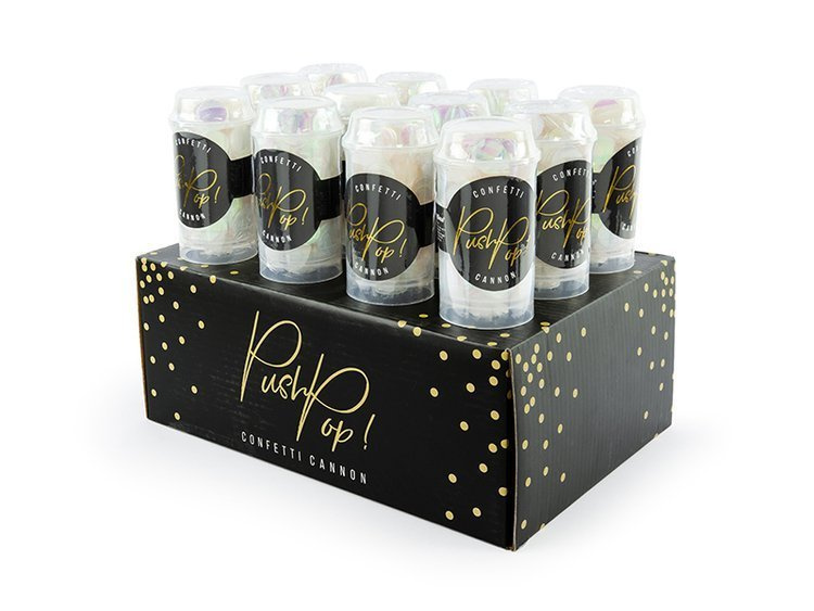 Push pop konfetti wykonane z folii w kolorze różowym opalizującym, średnica konfetti ok. 15 mm.(1 karton / 12 szt.)