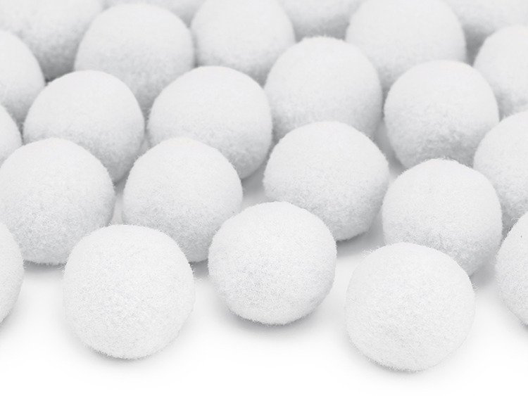 Pompony pluszowe w kolorze białym, średnica ok. 2 cm.(1 karton / 60 op.)(1 op. / 20 szt.)