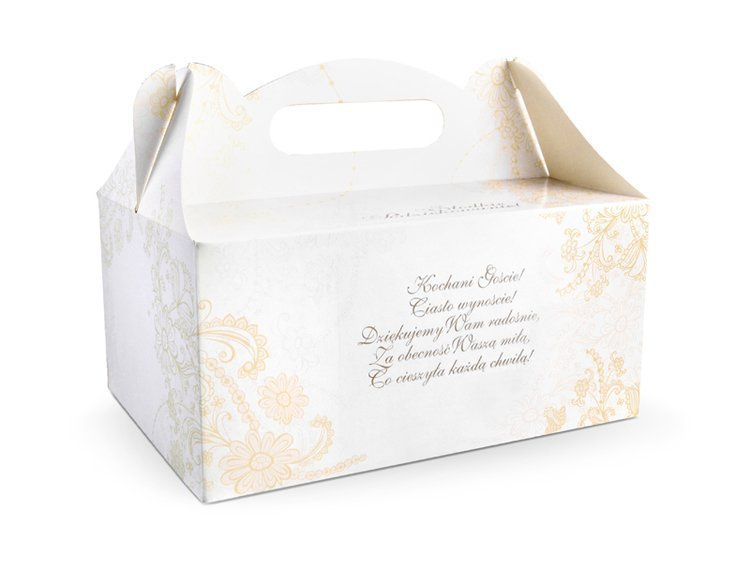 Ozdobne pudełka na ciasto weselne z papieru ze złotym nadrukiem i wierszykiem, wymiary pudełka po złożeniu 19x14x9 centymetrów.(1 karton / 20 op.)(1 op. / 10 szt.)